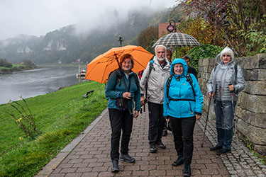 Nahezu regendicht verpackt rüsteten wir uns zum Angewöhnen für einen Wanderspaziergang Richtung → Amselsee (FOTOS) .