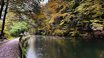 Am nächsten Tag - das Wetter war wie wir es vedienten: nicht zu warm, nicht zu kalt, manchmal Sonnenschein und kein Regen - ein kurzes Stück entlang des Amselsees und dann der Einstieg in den Berg hinauf → zur Bastei (FOTOS) .
