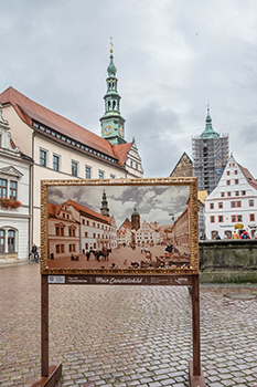 Eigentlich wollten wir ja den Spuren Canalettos auf dem nach ihm benannten Weg folgen.Das klappte zunächst recht gut, und wir waren noch frohen Mutes, als wir die Stufen zur Festung Sonnenstein (heute Landratsamt) erklommen. Wir freuten uns darauf, verschiedene Vedute wie die Fotomontage oben andeutet, um Bild und Wirklichkeit zu vergleichen. Aber kaum auf dem Sonnenstein angekommen, war der Canaletto-Weg weg, einfach weg. Trotz eifriger Bemühungen unter Einbeziehung der einheimischen Bevölkerung war dieser mangels Ausschilderung auch nicht mehr aufzutreiben, sodass wir ein bisschen missmutig in Richtung Elbe wieder abstiegen. Die Wegesqualität hob auch nicht gerade unsere Stimmung, aber der Elbweg