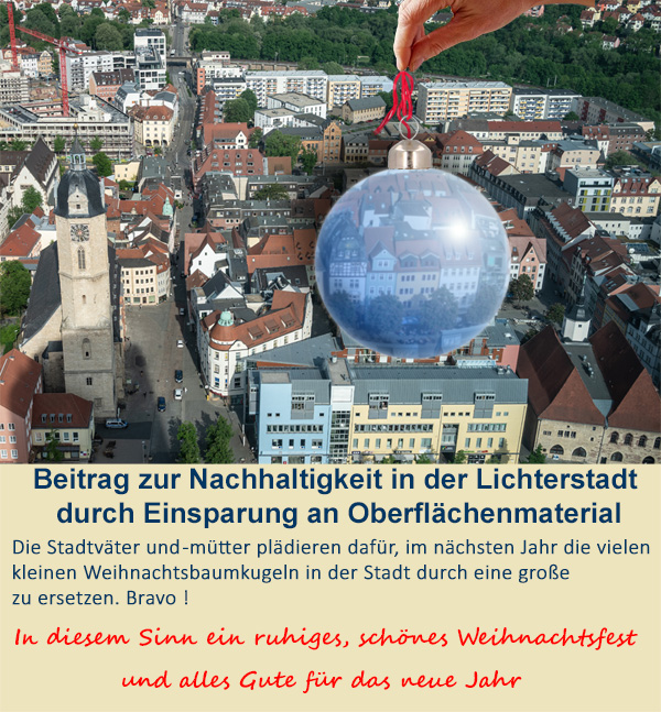 sicher in einen dafür geeigneten Ständer unter Beachtung rechtsverbindlicher EC-Normen einzuklemmen. Zwar (noch) nicht in der BRD flächendeckend verbreitet - ja noch nicht einmal allgemein bekannt - ist die Verbringung des Baumes nahezu frei schwebend an einem Deckenhaken. Ein galgenähnliches Konstrukt in der Farbe "Tannengrün" mutet etwas makaber an, ist aber besonders bei Raumhöhen über 4 ½ m eine gute Alternative. Der Platz unter dem Baum ist somit frei für die Unterbringung zusätzlicher Geschenke, und das Hantieren mit einem Staubsauger in der Nähe des Baumes ist nahezu unfallfrei möglich. Haken und Schwerpunkt des Baumes befinden sich lotrecht untereinander, und leichte Asymmetrien können durch geringfügiges Verschieben einzelner Weihnachtsbaumkugeln oder das Anbringen handelsüblicher Weihnachtsbaumausgleichsgewichte korrigiert werden. Kleinkinder und auch ältere Erwachsene schätzen das leichte, beruhigend wirkende Schwingen des Baumes. Durch das Anbringen einer robusten Spiralfeder - vielleicht ist eine aus aus der Matratze der ehelichen Bettstatt entbehrlich - zwischen dem Haken an der Decke und der Baumkrone, ist es mögllich, dass unser Tannenbaum auch in Richtung der z-Achse schwingen kann. Jauchtzer des Entzückens aller Weihnachtspartizipanten sind ein schöner Dank. Jedoch ist zu beachten, dass sich die Bodenfreiheit unter dem Baum periodisch ändert und unter dem Baum befindliche Geschenke durchaus gefährdet sein können. Der Deckenhaken kann entsprechen jahreszeitlicher Besonderheiten (mit einem Ei zu Ostern, einem Palmenwedel zu Pfingsten, einem Bikini- Oberteil im Sommer, einem Ährengebinde oder einem ausgehöhlten Kürbis im Herbst) geschmackvoll verkleidet werden. In diesem Sinne grüßt Euch Jochen (2014) |