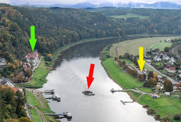 Eigentlich wollten wir ja den Spuren Canalettos auf dem nach ihm benannten Weg folgen.Das klappte zunächst recht gut, und wir waren noch frohen Mutes, als wir die Stufen zur Festung Sonnenstein (heute Landratsamt) erklommen. Wir freuten uns darauf, verschiedene Vedute wie die Fotomontage oben andeutet, um Bild und Wirklichkeit zu vergleichen. Aber kaum auf dem Sonnenstein angekommen, war der Canaletto-Weg weg, einfach weg. Trotz eifriger Bemühungen unter Einbeziehung der einheimischen Bevölkerung war dieser mangels Ausschilderung auch nicht mehr aufzutreiben, sodass wir ein bisschen missmutig in Richtung Elbe wieder abstiegen. Die Wegesqualität hob auch nicht gerade unsere Stimmung, aber der Elbweg
