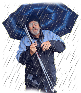 Das gleichzeitige sachgerechte Händling verschiedener Gegenstände, Geräte und sonstiges (1 Regenschirm, 2 eigentlich auf beide Arme zu verteilende Walking-Stöcke, 1 Fotoapparat, 1 Handy und 1 Hilfe suchende Hand der Ehefrau) ist besonders bei Regen